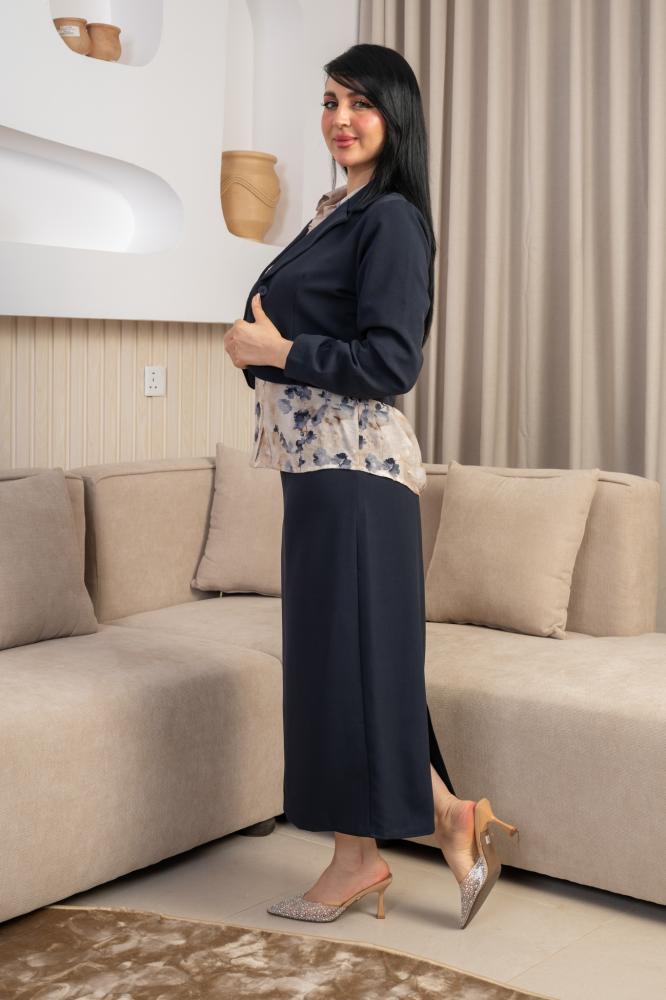 3. التنورة /الطويلة: تنورة بقصة مستقيمة ومريحة، بلون سادة متناسق مع الجاكيت، مما يمنح الطقم مظهراً أحادياً متماسكاً وأنيقاً.